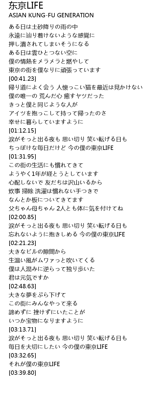 | [03:23.36] | 毎日を大切にしたい 今の僕の東京LIFE |