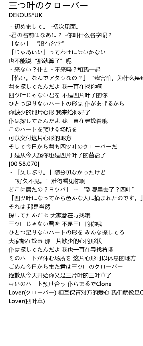 | [00:47.040] | そして今日から君も四ツ叶のクローバーだ 于是从今天起你也是四片叶子的苜蓿了 |