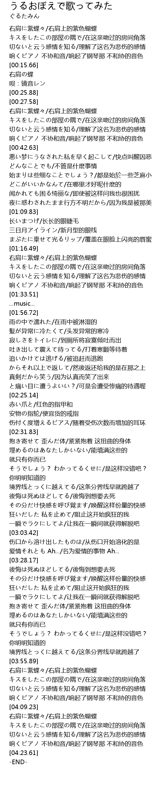 | [01:17.19] | 右肩に紫蝶々/右肩上的紫色蝴蝶 |