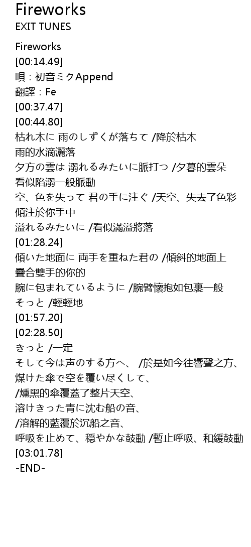 | [00:02.34] | Fireworks |