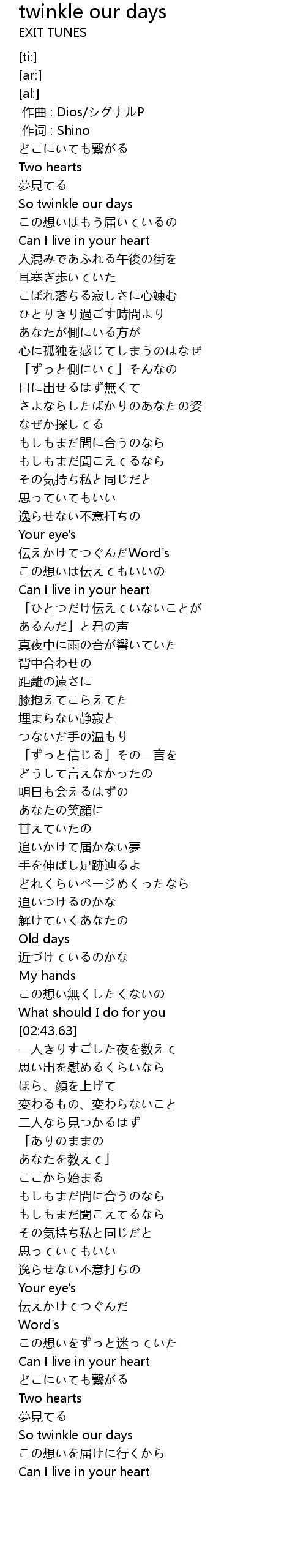 | [00:01.00] | 作词 : Shino |