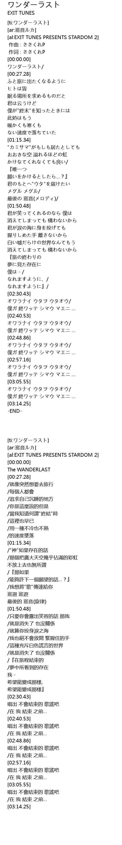 | [02:33.42] | オワラナイ ウタヲ ウタオウ/ |