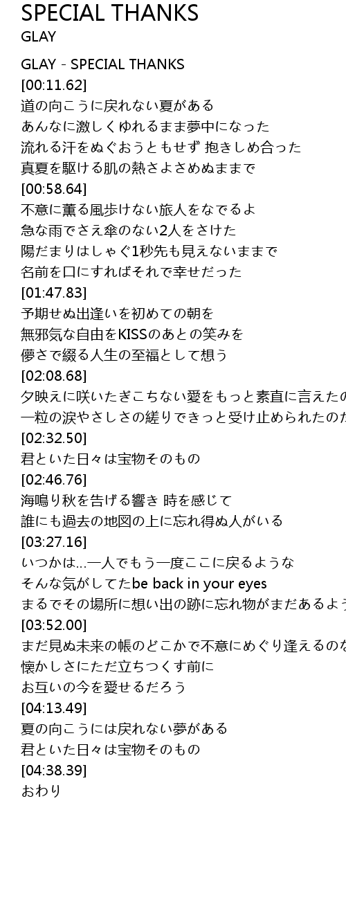 | [00:00.00] | GLAY - SPECIAL THANKS |