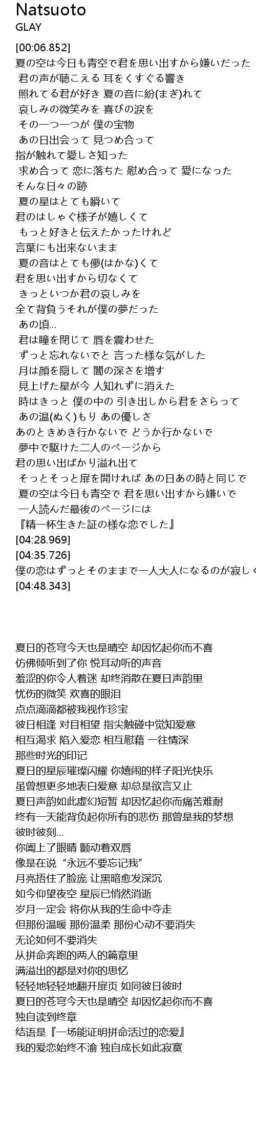 | [00:06.852] | 夏の空は今日も青空で君を思い出すから嫌いだった |