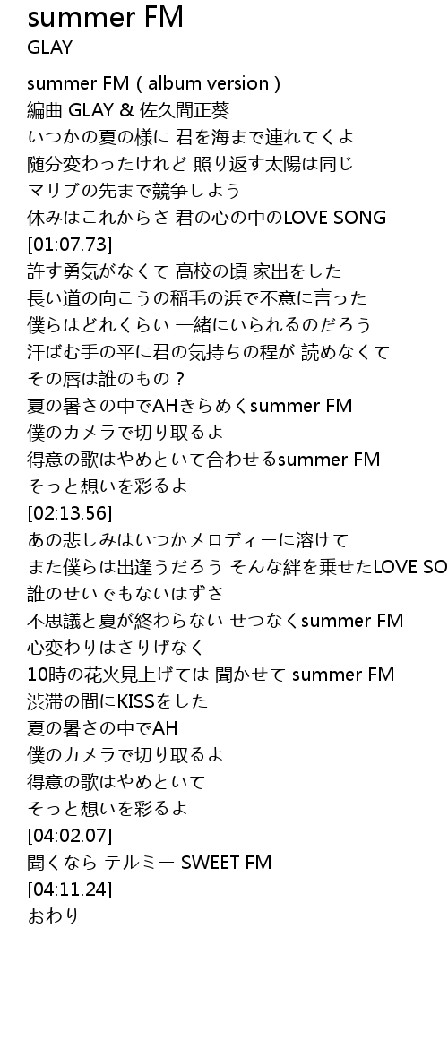 | [01:58.51] | 得意の歌はやめといて合わせるsummer FM |