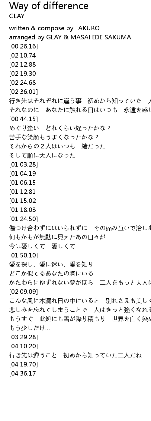| [00:22.10] | arranged by GLAY & MASAHIDE SAKUMA |