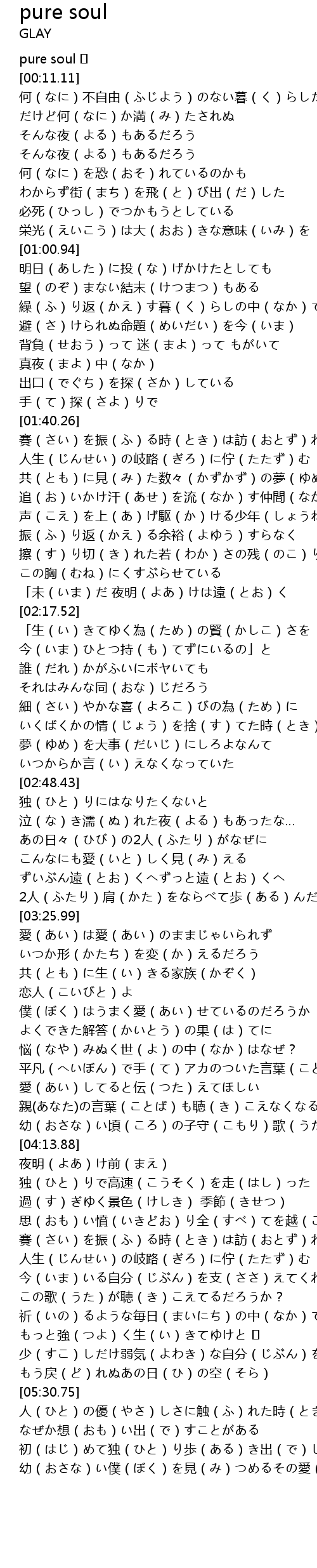 | [05:31.17] | 人(ひと)の優(やさ)しさに触(ふ)れた時(とき) なぜか想(おも)い出(で)すことがある |