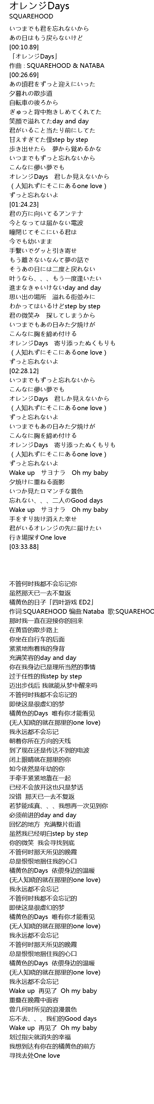 | [02:18.35] | オレンジDays 寄り添ったぬくもりも |