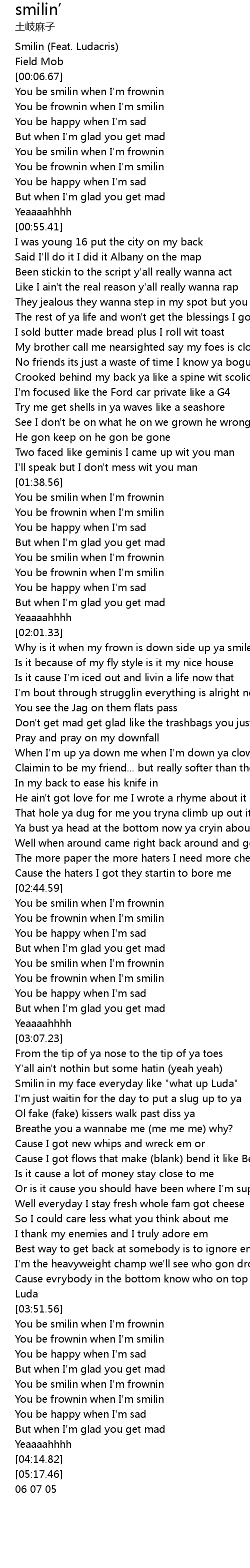 | [00:01.93] | Smilin (Feat. Ludacris) |
