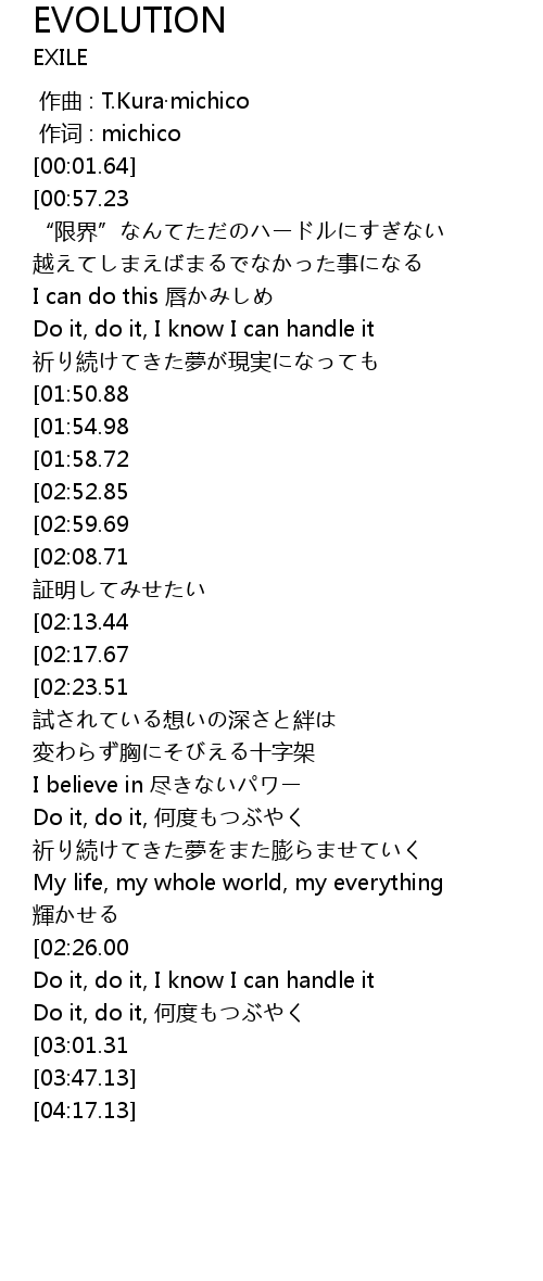 | [01:30.20][02:23.51][03:16.73][03:34.58] | Evolution |