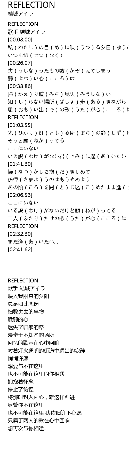 | [00:52.33] | 思(おも)い出(で)の歌(うた)が心(こころ)に REFLECTION |