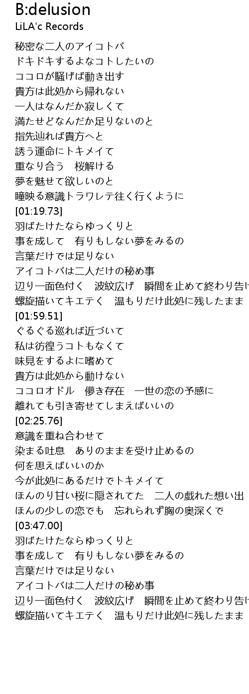 | [01:29.57] | アイコトバは二人だけの秘め事 |