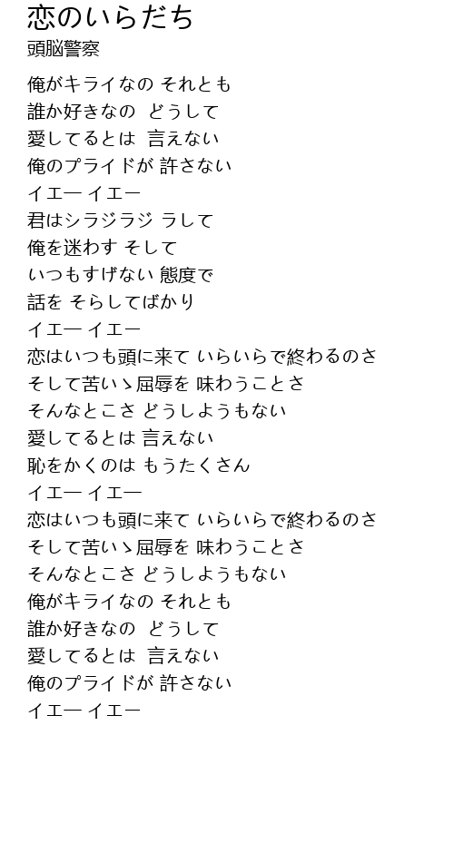 | [01:52.000] | 恋はいつも頭に来て いらいらで終わるのさ |