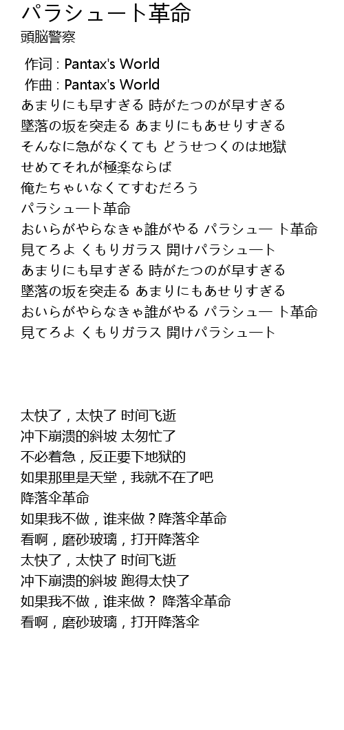 | [00:58.70] | おいらがやらなきゃ誰がやる パラシュ一 ト革命 |