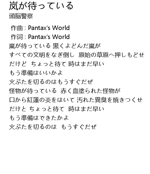 | [01:18.000] | もう準備はいいかよ 火ぶたを切るのはもうすぐだぜ |