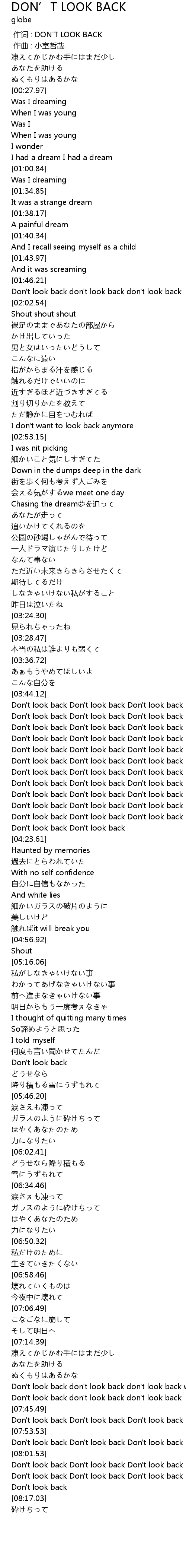| [08:03.92] | Don' t look back Don' t look back Don' t look back |