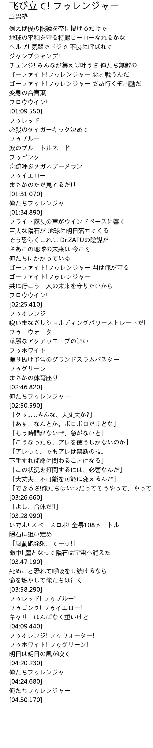 | [02:10.480] | ゴーファイト!フゥレンジャー 君は俺が守る |