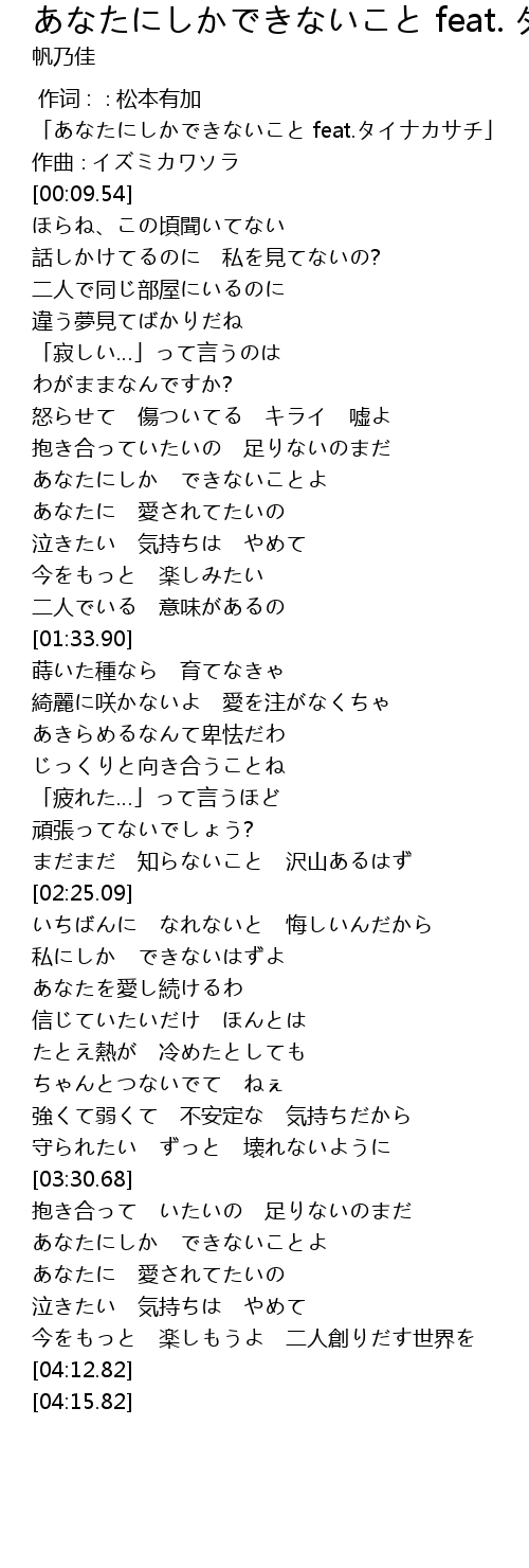 | [00:01.54] | 「あなたにしかできないこと feat.タイナカサチ」 |