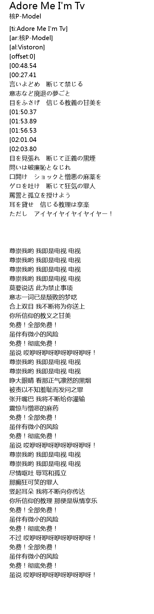 | [00:20.29][00:27.41][00:34.71][00:41.86][01:25.24][01:32.26][03:00.55][03:07.68] | 崇めよ我はTV TV |