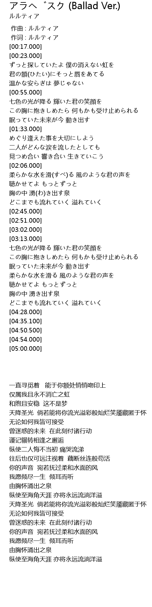 | [00:25.100] | ずっと探していたよ 僕の消えない虹を |