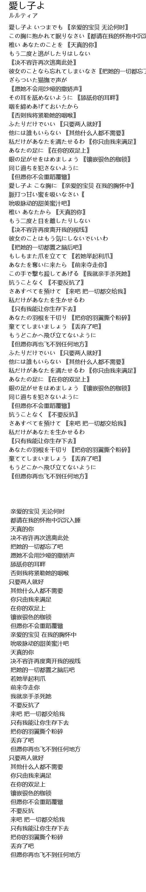 | [03:22.340] | あなたの羽根を千切り 〖把你的羽翼撕个粉碎〗 |