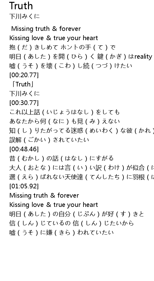 | [00:41.88] | 知(し)りたがってる迷惑(めいわく)な彼(かれ) 誤解(ごかい)されていたい |