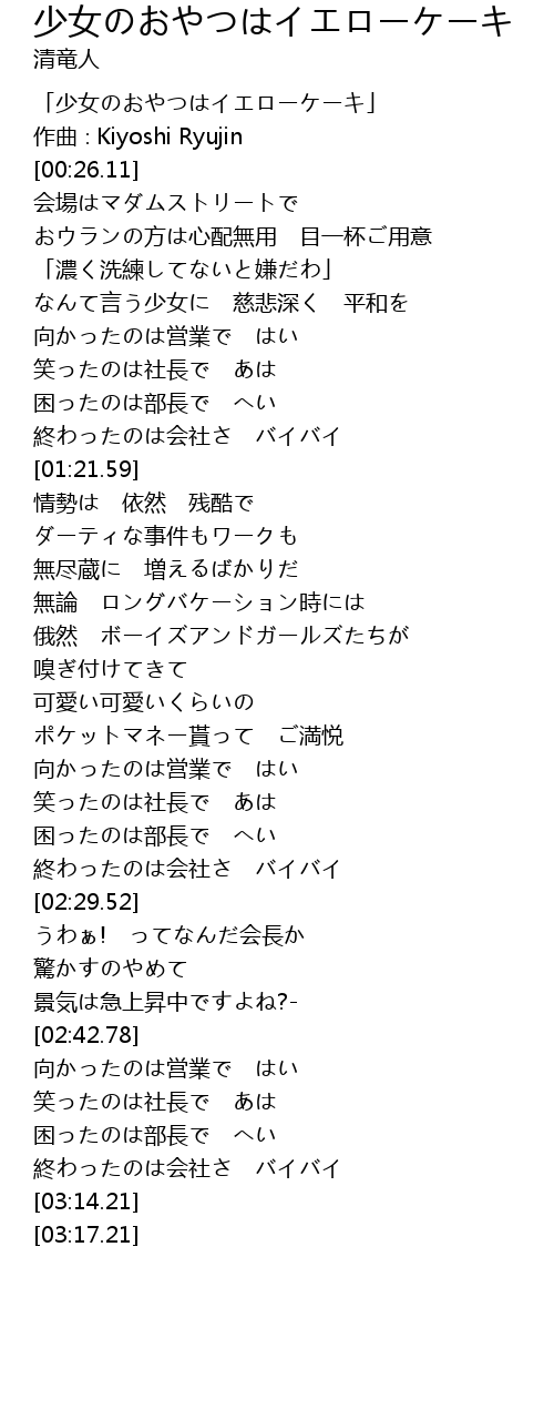 | [00:01.11] | 「少女のおやつはイエローケーキ」 |