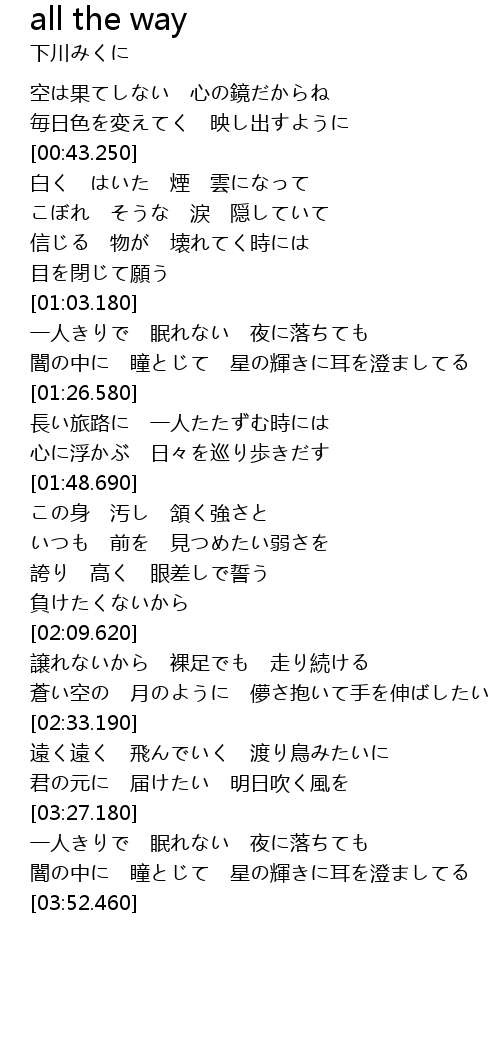| [03:08.580] | 遠く遠く 飛んでいく 渡り鳥みたいに |