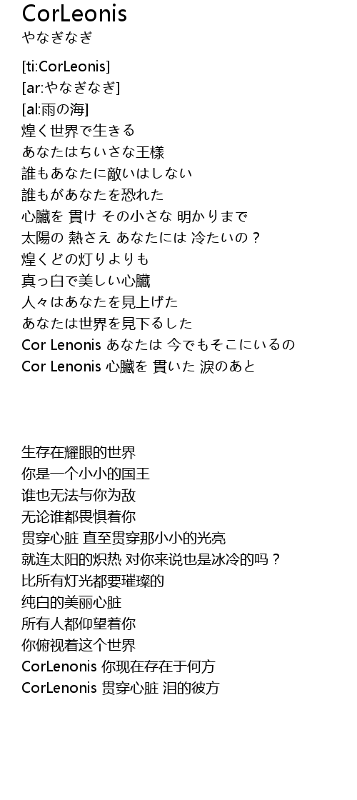 | [02:02.18] | Cor Lenonis 心臟を 貫いた 淚のあと |