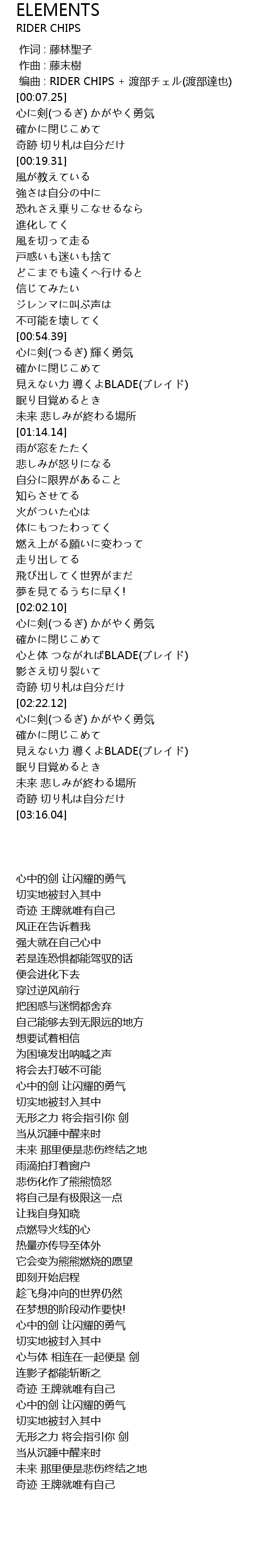 | [00:02.000] | 编曲 : RIDER CHIPS + 渡部チェル(渡部達也) |
