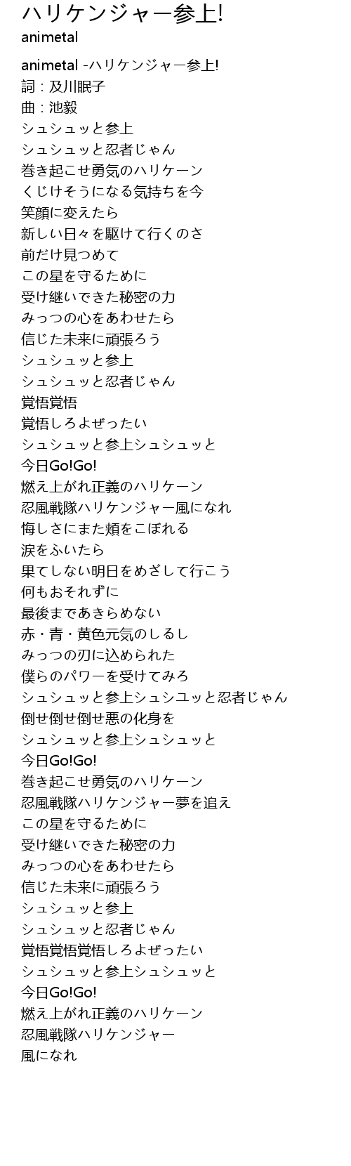 | [00:00.15] | animetal -ハリケンジャー参上! |