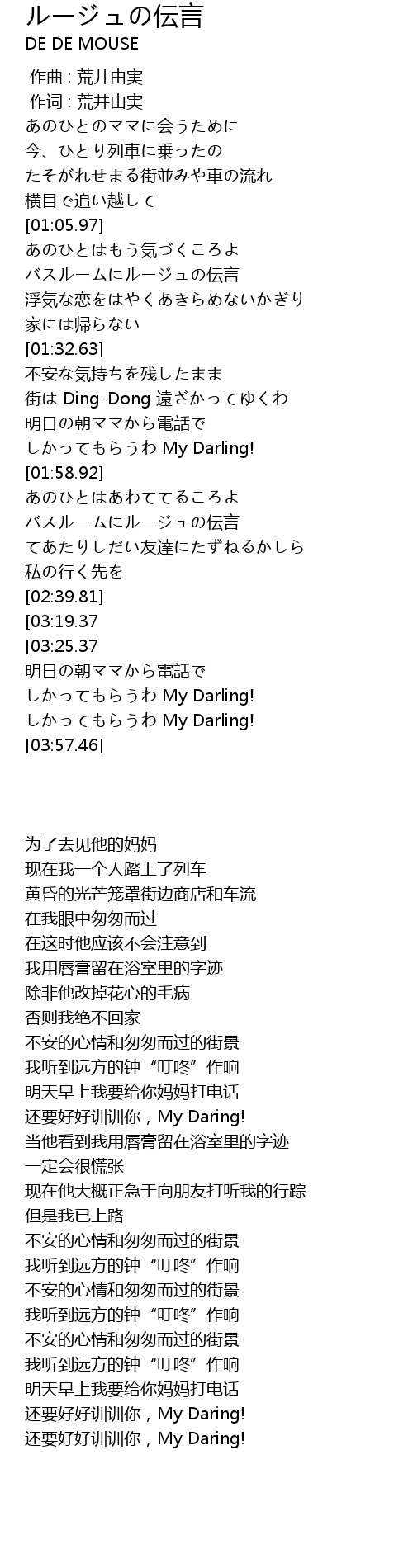 | [03:00.39][03:25.37][03:38.37] | 街は Ding-Dong 遠ざかってゆくわ |