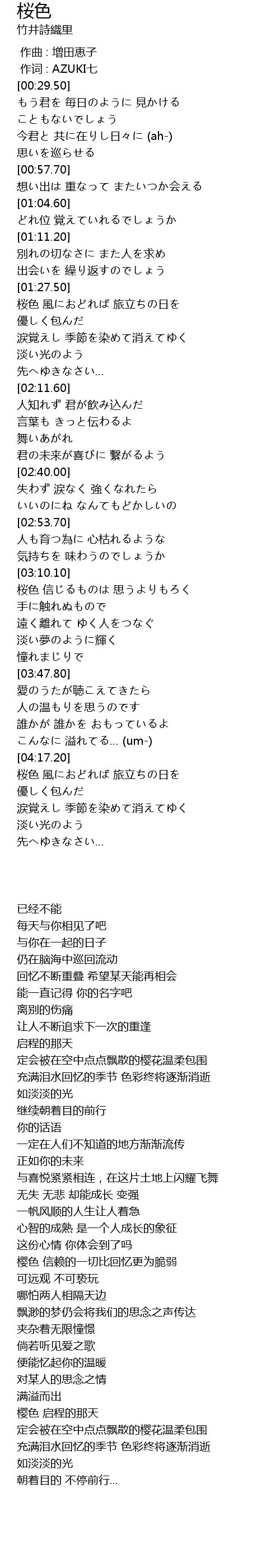 | [04:17.27] | 桜色 風におどれば 旅立ちの日を |