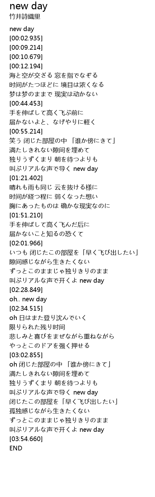 | [02:21.262] | 叫ぶリアルな声で开くよ new day |