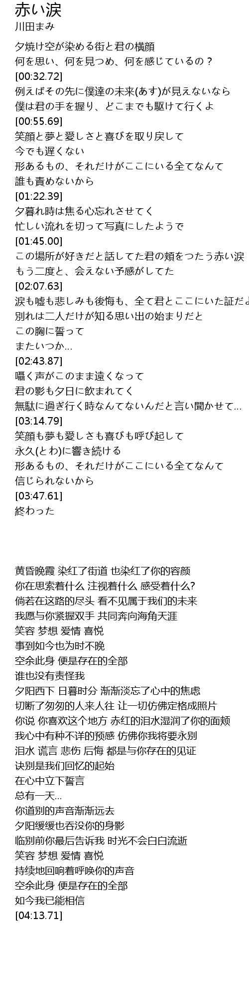 | [01:45.80] | この場所が好きだと話してた君の頬をつたう赤い涙 |