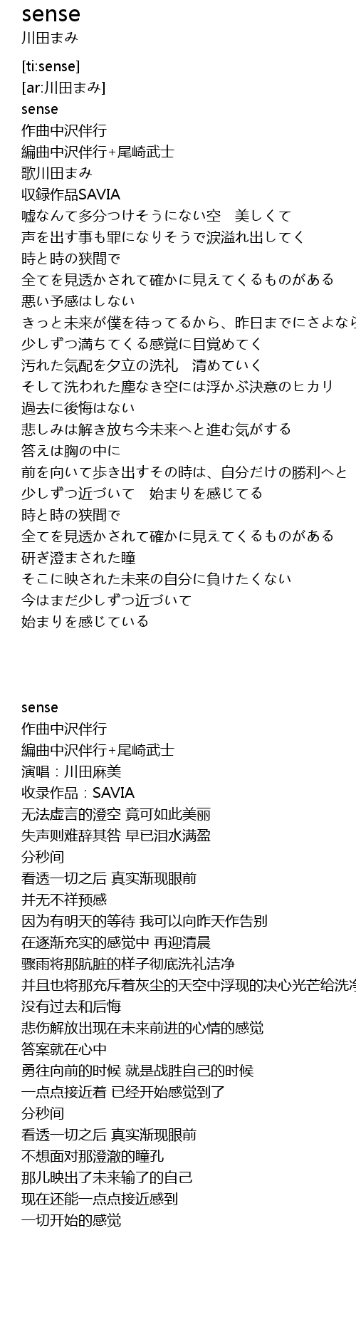| [02:04.486] | 悲しみは解き放ち今未来へと進む気がする |
