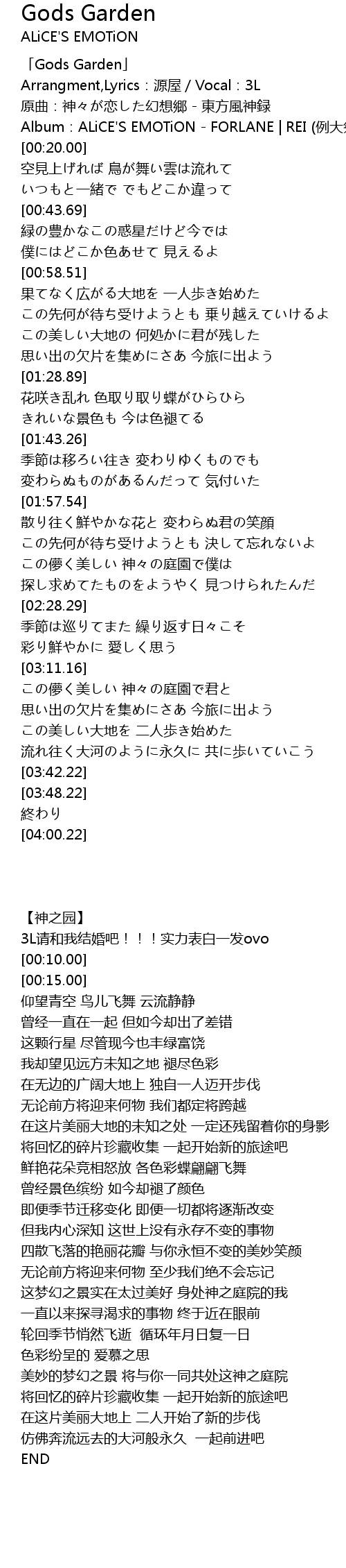 | [00:10.00] | 原曲:神々が恋した幻想郷 - 東方風神録 |