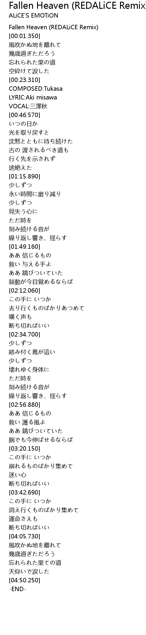 | [00:00.000] | Fallen Heaven (REDALiCE Remix) |