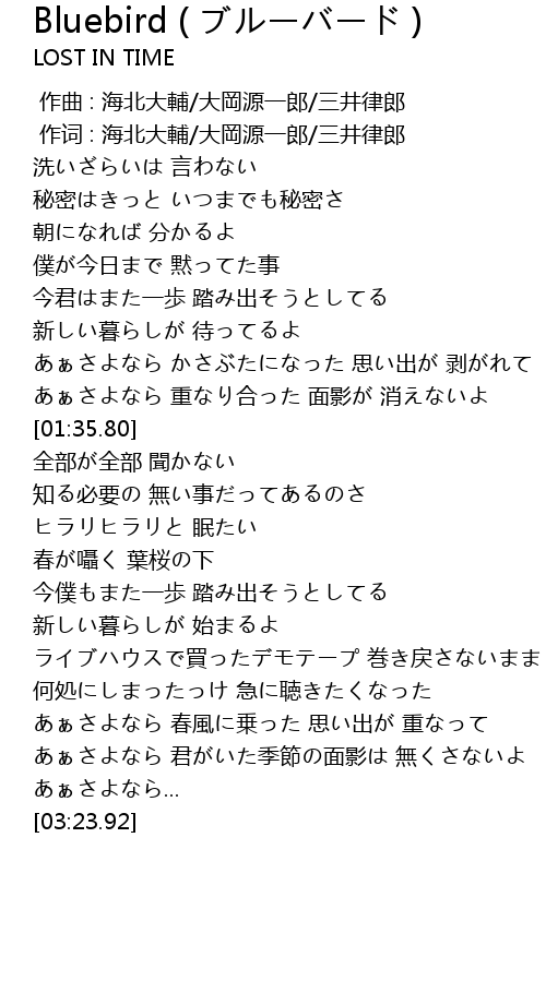 | [00:01.000] | 作词 : 海北大輔/大岡源一郎/三井律郎 |