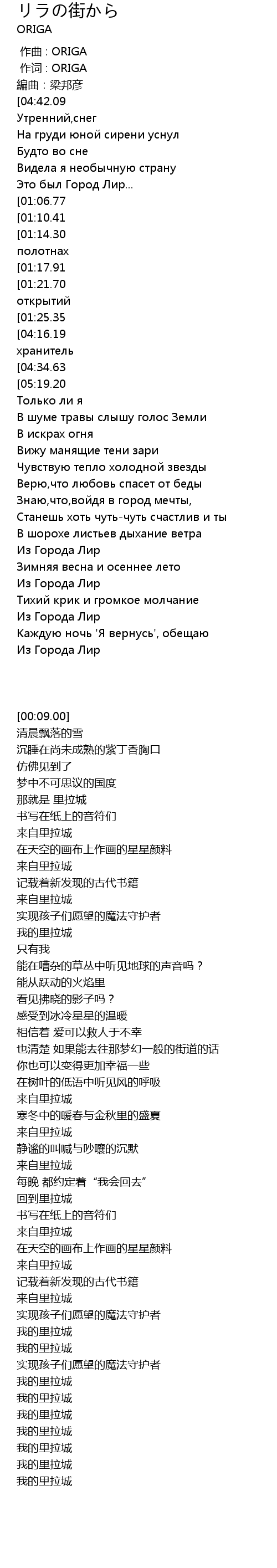 | [04:49.18][04:34.63][04:23.53][04:19.85][01:32.70] | Моего Города Лир |