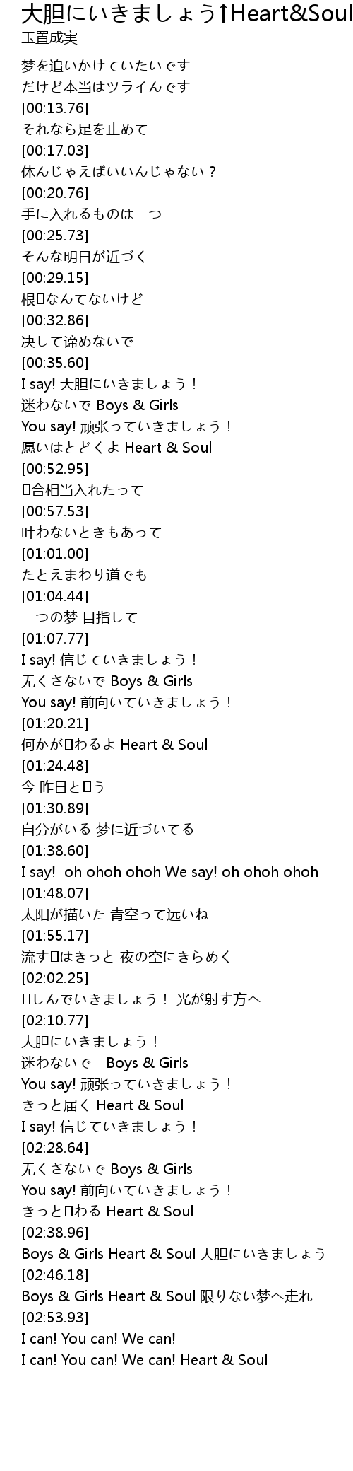 | [02:46.73] | Boys & Girls Heart & Soul 限りない梦へ走れ |
