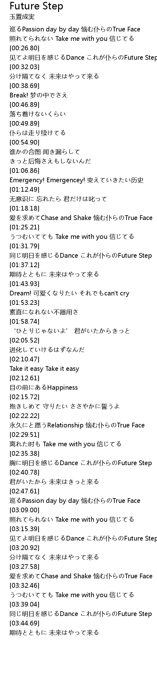 | [02:36.13] | 胸に明日を感じるDance これが仆らのFuture Step |