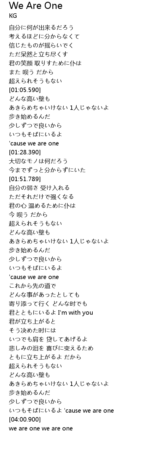 | [03:54.579] | いつもそばにいるよ 'cause we are one |
