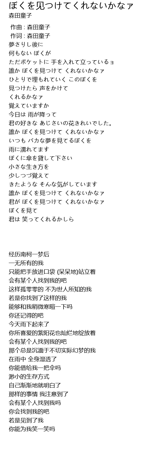 | [00:40.49] | 誰か ぼくを見つけて くれないかなァ |