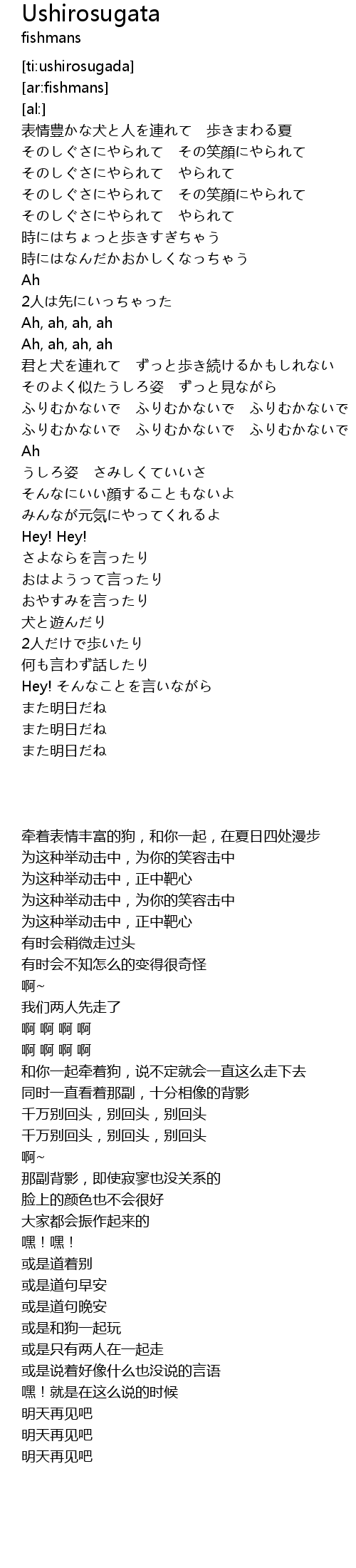| [01:39.89] | 君と犬を連れて ずっと歩き続けるかもしれない |