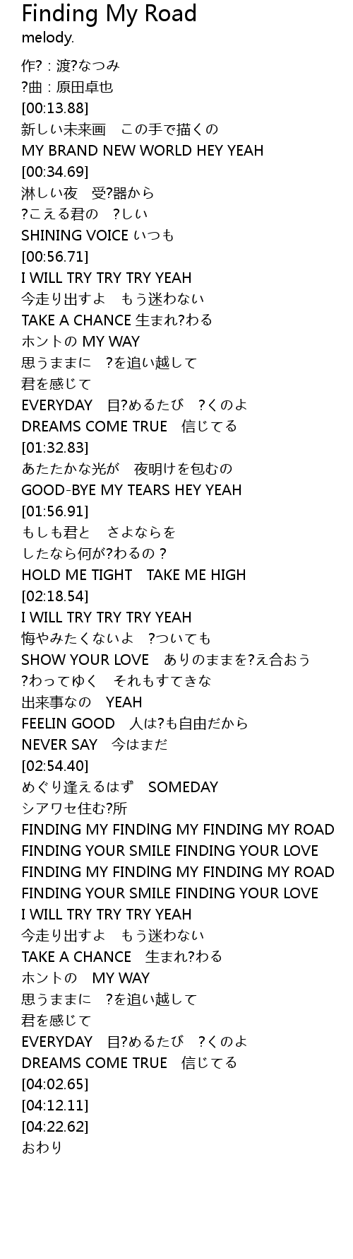 | [03:13.14] | FINDING MY FINDlNG MY FINDING MY ROAD |