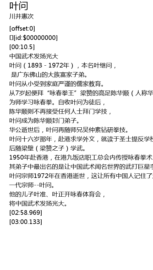 | [02:01.970] | 其弟子中最出名的是让中国武术闻名世界的武打巨星李小龙。 |