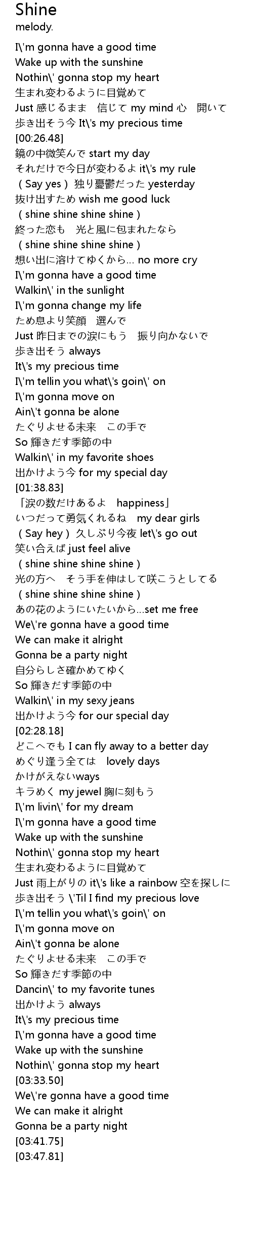 | [00:21.29] | 歩き出そう今 It\'s my precious time |