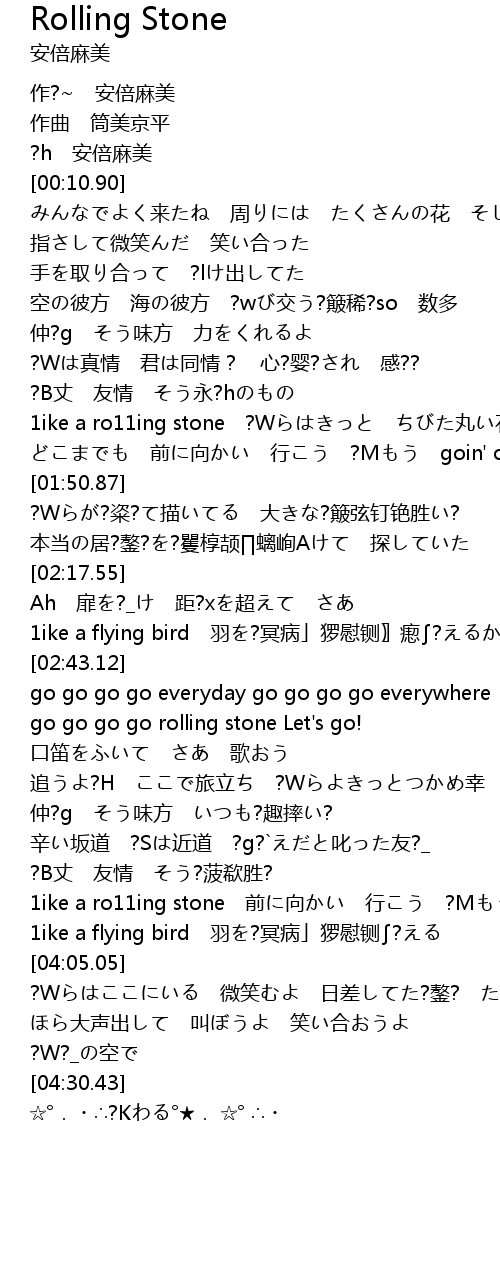 | [03:42.89] | 1ike a ro11ing stone 前に向かい 行こう ?Mもう さあ |