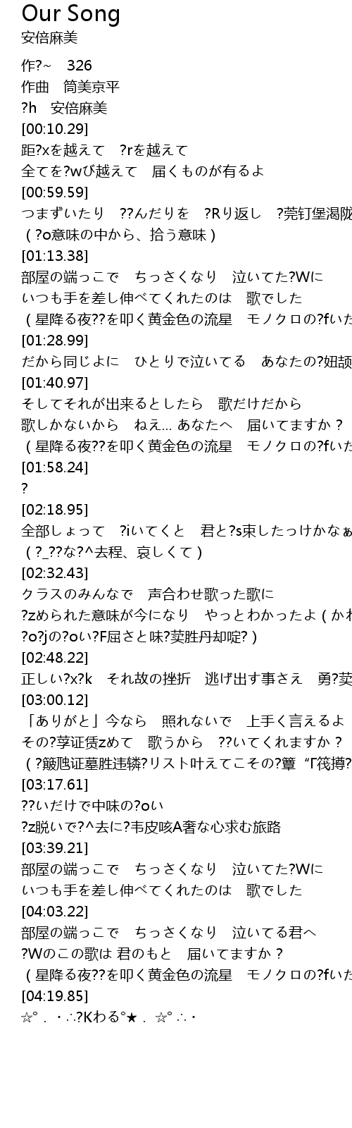 | [02:40.55] | ?zめられた意味が今になり やっとわかったよ(かわいそな自分に?Eいあぐらかいてた?^去... ?o?jの?oい?F屈さと味?荬胜丹却啶?) |